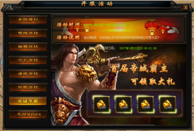 活动内容:开服活动期间,在首次帝城争霸战中获胜的行会会长可获得10000元宝的丰厚奖励,奖励以邮件的形式发放。