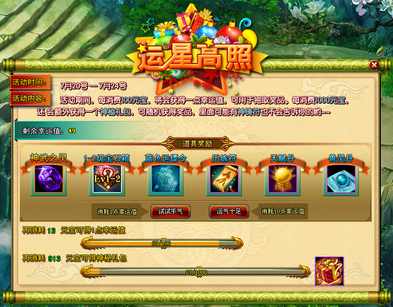 【活动内容】活动时间内,玩家每消费满100元宝,即可获得一点幸运值,幸运值可用于抽取奖品;同时每消费满1000元宝,还将额外获得一个神秘礼包,打开神秘礼包有机会获得神铸符等超值大礼。