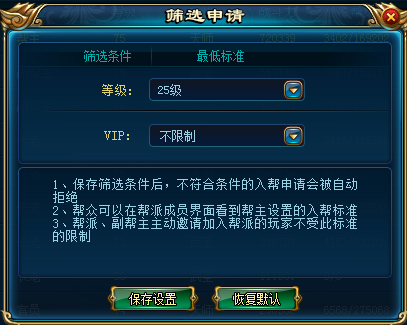 3、 新增帮主可设定申请加入帮派的条件,包括等级、vip等等;