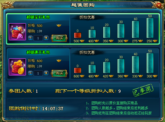 活动期间,每天都可以团购超值礼包。参与人数越多,折扣越丰厚,最多可享受5折优惠。
