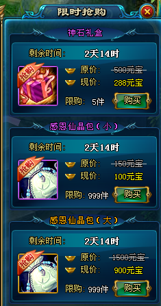 活动期间,商城出售珍稀礼包:神石礼包和仙晶礼包