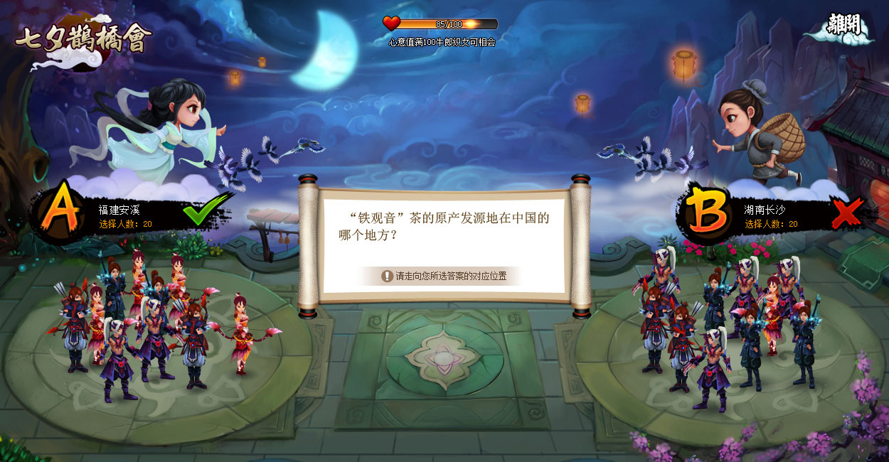 - 活动时间内玩家点击活动图标进入七夕场景,通过答题获得心意值,心意值满100可使牛郎织女相会;