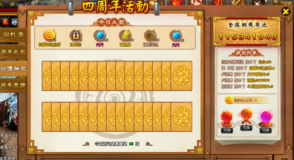 活动规则:活动期间,玩家每天可获得一定的免费抽奖次数进行抽奖,抽奖除了可以获得奖励以外还可以获得四周年纪念币,集齐一定数量的纪念币即可兑换丰厚大奖。
