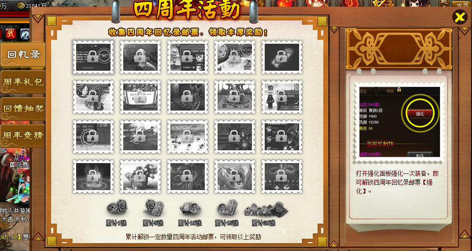活动规则:活动期间,活动期间收集四周年回忆录邮票,领取丰厚奖励,每张回忆邮票需要完成特殊的解锁条件方可进行解锁。