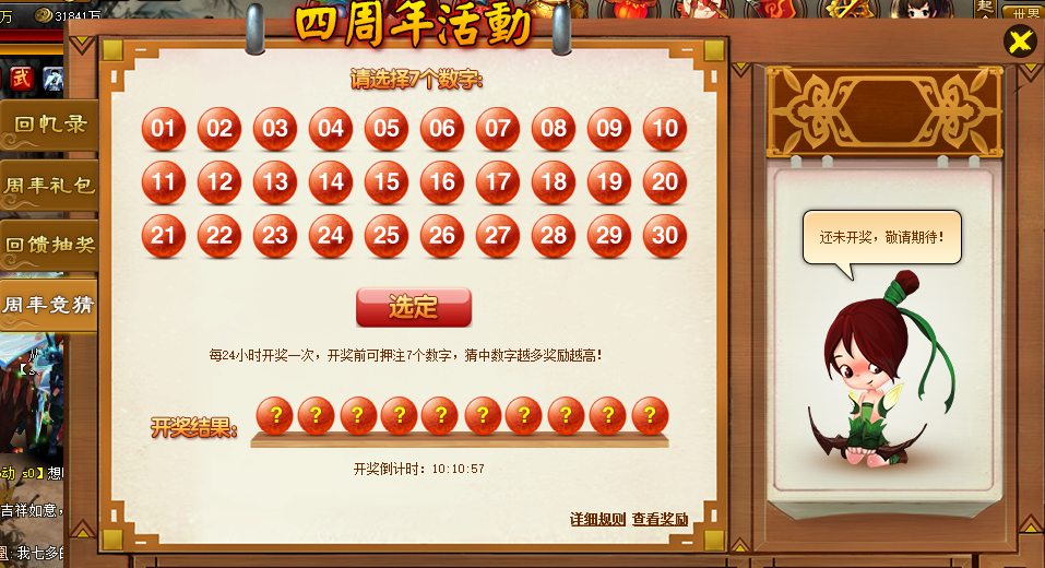 活动规则:活动期间,每24小时开奖一次,开奖前可押注7个数字,猜中数字越多奖励越高。