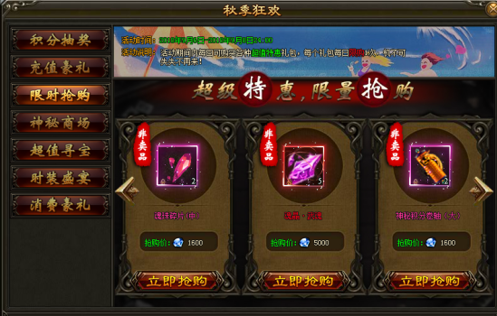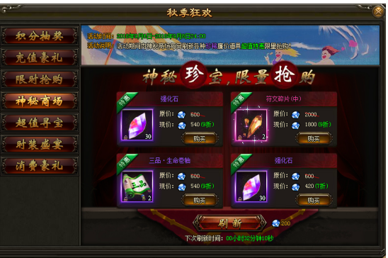 2. 活动期间内,神秘商场每日刷新各种珍稀道具,打折出售限量抢购。