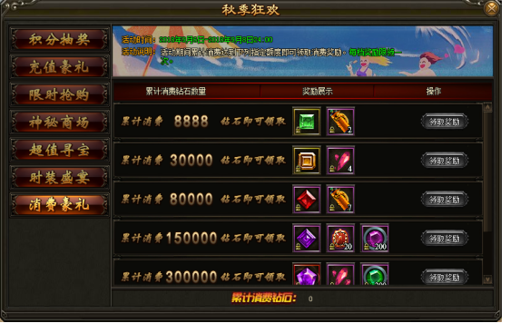 2. 活动期间内,消费指定档次的钻石可免费领取超级豪华礼包,更有高级攻击宝石、韧性宝石、九霄妖核、救赎妖核等稀有道具