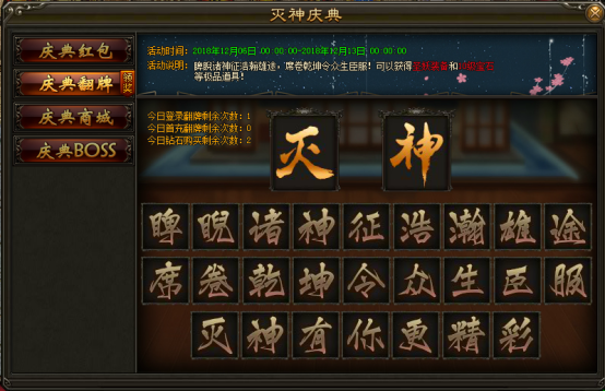 2. 活动期间内,每日达到指定条件可进行一次翻牌,有几率获得圣妖装备和10级宝石等珍稀道具!