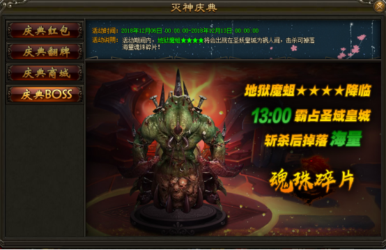 2. 活动期间,每日的13:00地狱魔蛆将会攻占剩余皇城,现召集全体灭神狂战士将其斩杀。斩杀可掉落海量魂珠碎片