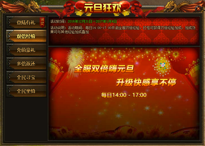 »î¶¯ËµÃ÷£ºÔªµ©»î¶¯ÆÚ¼ä£¬Ã¿Ìì14:00-17:00¿ªÆôÈ«·þË«±¶¾Ñ飬ÏíÊÜÉý¼¶¿ì¸Ð