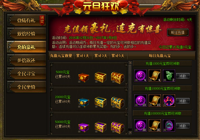 »î¶¯ËµÃ÷£º»î¶¯ÆÚ¼ä£¬Ã¿ÈÕ³äÖµÒ»¶¨µÄÔª±¦¿ÉÁìÈ¡¶ÔÓ¦µÄ½±Àø£¬Á¬Ðø³äÖµ¿ÉÁìÈ¡À۳佱Àø¡£