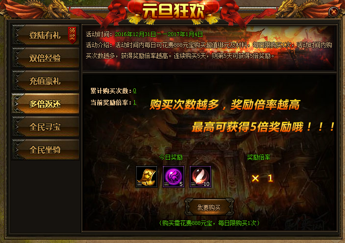 »î¶¯ËµÃ÷£º»î¶¯ÆÚ¼ä£¬Ã¿ÈÕ»¨·Ñ888Ôª±¦¹ºÂò³¬Öµ°óÔª²ÄÁÏ£¬Ã¿ÈÕÏÞ¹º1³Ô£¬»î¶¯Ê±¼äÄÚ¹ºÂò´ÎÊýÔ½¶à£¬·µ»¹±¶ÂÊÔ½¸ß£¡Á¬Ðø¹ºÂò5¿É×î¸ß¿É´ï8±¶