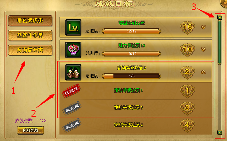 1. 左侧为成就总分类目录,点击不同种类,显示该种类下所有的成就目标。