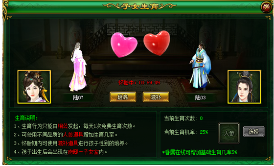 【生育行为】:只能由相公/主人发起,每天有一次免费生育次数。