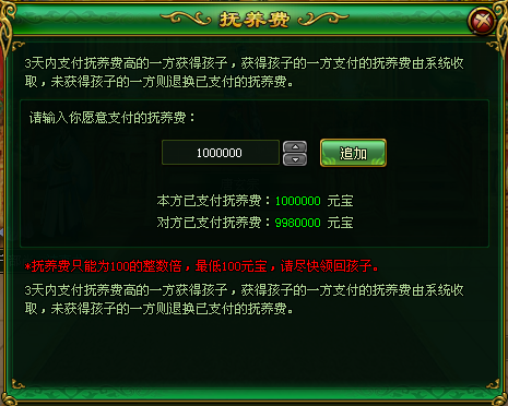 【领回孩子】夫妻(此处“妻”意为正室)离婚后三天内,双方均可通过【紫宸殿-户部尚书】竞拍争取子女的归属权,竞拍结束后,出价低的一方系统将会返还其元宝,若无人领养,子女将被系统回收。