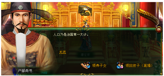 在紫宸殿—户部尚书处,单身玩家通过领养也可以拥有自己的子女!