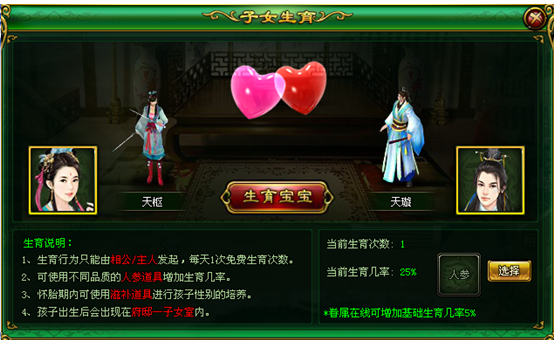 【生育几率】:几率越高,怀胎成功的可能性越大,可使用人参提高怀胎几率。