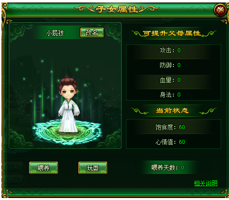 3、孩子分为幼年期和成年期,幼年期时孩子的成长速度和饱食度、心情值挂钩,饱食度、心情值(二者不可缺一)越高,则孩子成长越快。