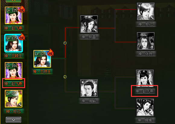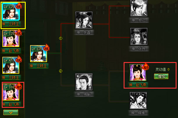 2、家丁助阵树形图为固定组合,每个橙色品质以上的家丁都可作为被助阵的对象,选中的被助阵家丁头像出现在助阵树状图的第一个位置,其他枝状位置未启动前为灰色,可拖动左侧助阵家丁头像至对应位置即可启动该位置: