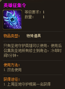 每周日00:00,【上周守护】榜排行第一的修士,获得“圣地英雄”身份、称号,并收到内含10枚“英雄征集令”的系统信件