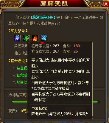 应众位修士的要求,我们在弑神塔闯关受阻提示界面新增毒火雷冰特殊属性的提示,给众位修士提供更全面的指引。