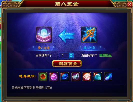 1. 【腊八宝盒】掉落后有绑定不绑定,每个宝箱需要配合一个钥匙才能开启。