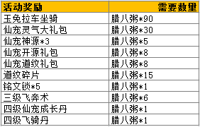 【活动内容】腊八过节吃什么?当然是腊八粥,腊八粥乃是本次腊八节的重头戏,通过开启腊八宝盒活动获得的【腊八粥】,可在游戏兑换各种珍贵道具,包括:玉兔坐骑等珍贵道具!