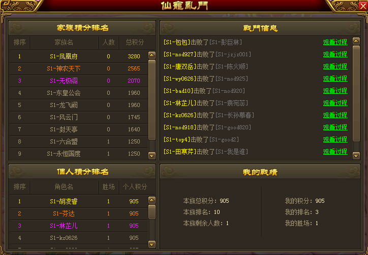 d. 报名成功后,可在界面中部查看已报名的家族、个人的仙宠战力排名,知己知彼