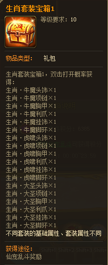 b. 家族排名奖励:生肖宝箱碎片(总积分排名前10的家族获得,发放到家族祭坛,由族长分配;可在【炼制-仙宠道具-仙宠生肖套装】处炼制为生肖套装宝箱1)