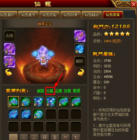 应众位修士要求,我们在【仙宠-仙宠装备】界面增加了“分解”的快速链接,方便修士们操作。