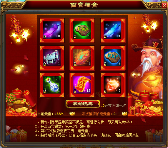 注:百宝福盒使用时将有物品预览,开启后物品位置将随机重置;
