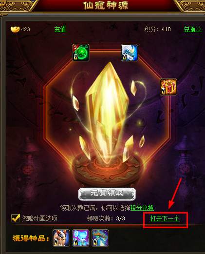 当背包中有多个神源时,点击神源界面右下角的“打开下一个”可快速开启新的神源