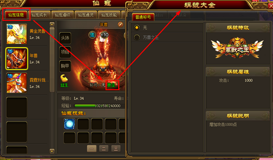 获取仙宠称号后,可为出战仙宠佩戴,称号显示在场景中,特殊称号更可为出战仙宠加成属性