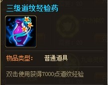 (2)兑换公式:1个道纹碎片可兑换1个【三级道纹经验药】(使用可得7000点道纹经验)