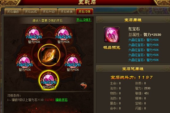 全身装备镶嵌的某种灵石的等级、个数达到要求后,即可激活该灵石对应种类的宝石,通过淬炼获得大量的额外属性加成