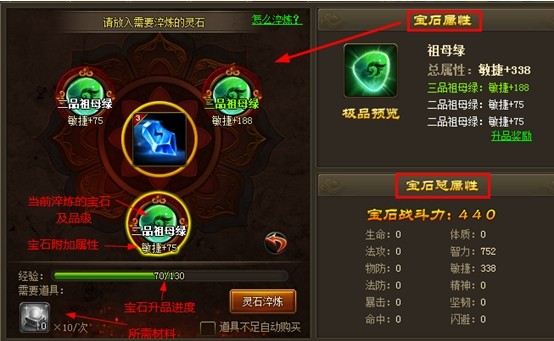 b. 宝石从低到高分为一品至九品,品级越高属性越高,且淬炼所要求达到的灵石条件越高
