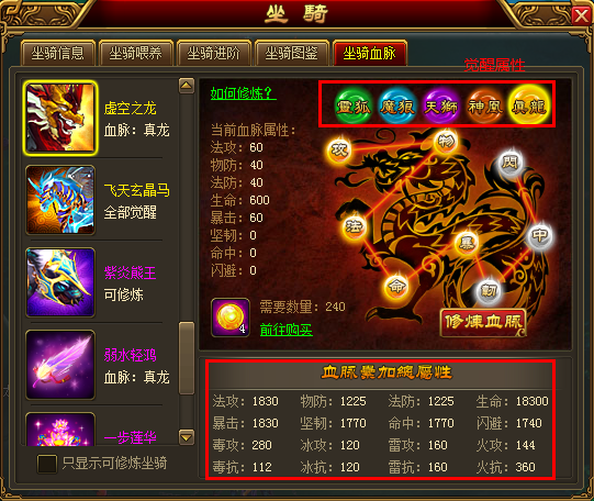 c. 每次修炼会消耗不同量的血脉珠,越高颜色的坐骑,越高级的血脉,修炼需要的材料越多,提升的属性也越大