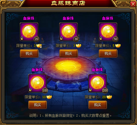 b. 血脉珠每日限量供应,每天只需花费60绑定元宝即可获得20个血脉珠,不容错过