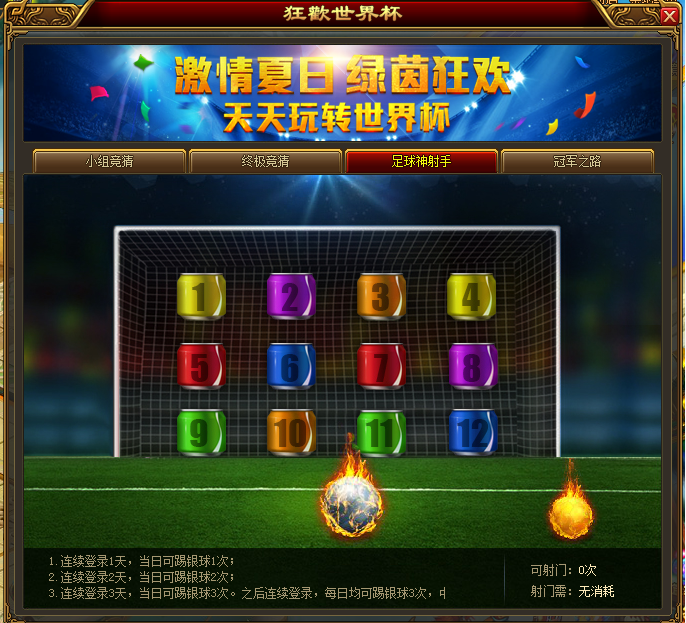 2014年6月18日09:00-2014年7月15日23:59期间可以进行足球神射手活动,每天可以踢球若干次;