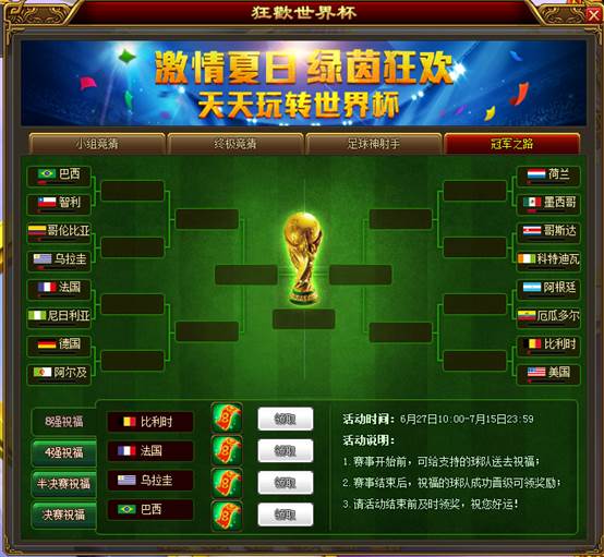 活动期间,玩家可以进行世界杯冠军之路活动,为您支持的球队送上祝福!