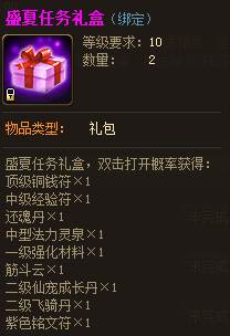 【活动内容】活动期间,完成除魔正道,圣地刺探,守卫圣地,百炼成仙,诛魔令,仙人助凡,护送神源等日常活动,可获得【盛夏任务礼盒】×2奖励。完成守卫圣地、除魔正道、护送神源还能获得【祈福彩带惊喜包】×1奖励。