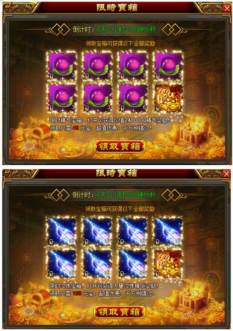 【活动内容】活动期间,每天参与点石成金活动,就有机会获得限时宝箱(活动期间内可以使用,逾期将不能使用),使用不绑定元宝就能领取超值物品,不容错过哟!
