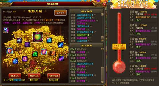 “狂欢不停”:全服所有玩家消耗不绑定元宝都可以让本服狂欢值上涨,每消耗1不绑定元宝全服狂欢值增加1,当狂欢值达到18888、38888、888888、128888、168888的时候,可以触发全服性事件;
