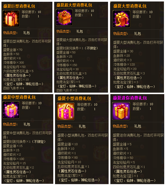 4、活动期间累计消费不绑定元宝达到6888,即可领取【盛夏大型消费礼包】×1(绑定);