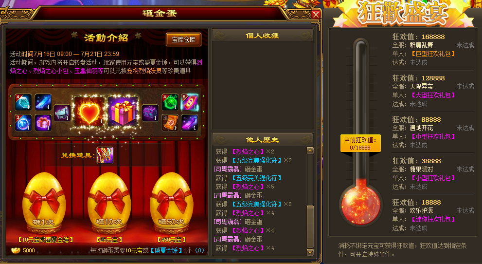 “狂欢不停”:全服所有玩家消耗不绑定元宝都可以让本服狂欢值上涨,每消耗1不绑定元宝全服狂欢值增加1,当狂欢值达到18888、38888、888888、128888、168888的时候,可以触发全服性事件;