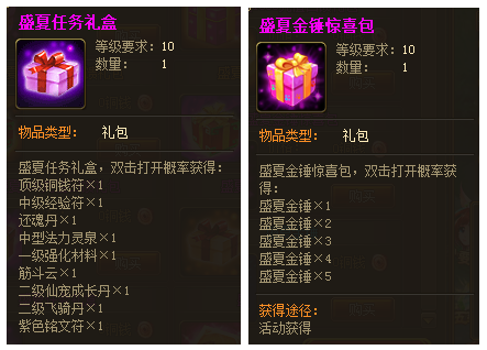 【活动内容】活动期间,完成除魔正道,圣地刺探,守卫圣地,百炼成仙,诛魔令,仙人助凡,护送神源等日常活动,可获得【盛夏任务礼盒】×2奖励。完成守卫圣地、除魔正道、护送神源还能获得【盛夏金锤惊喜包】×1奖励。