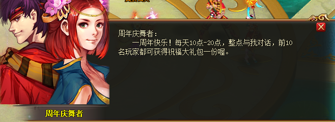【活动内容】周年庆活动期间,圣城每天将有舞者进行巡演,每天10点~20点,整点时间游龙舞者头上将出现任务叹号,与舞者对话,前10名玩家可获得一个“祝福大礼包”,奖励直接发送到背包。