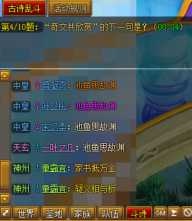【活动内容】活动期间,游戏内将开启“古诗乱斗”活动,活动开启时,聊天窗口上方会出现古诗的上一句,在聊天窗口【斗诗】频道回答对下一句即可获得奖励;最先抢答成功的玩家可以获得黄金战魔召唤卷轴;最先答对的三位玩家还能获得【抢答礼包】×1(绑定);