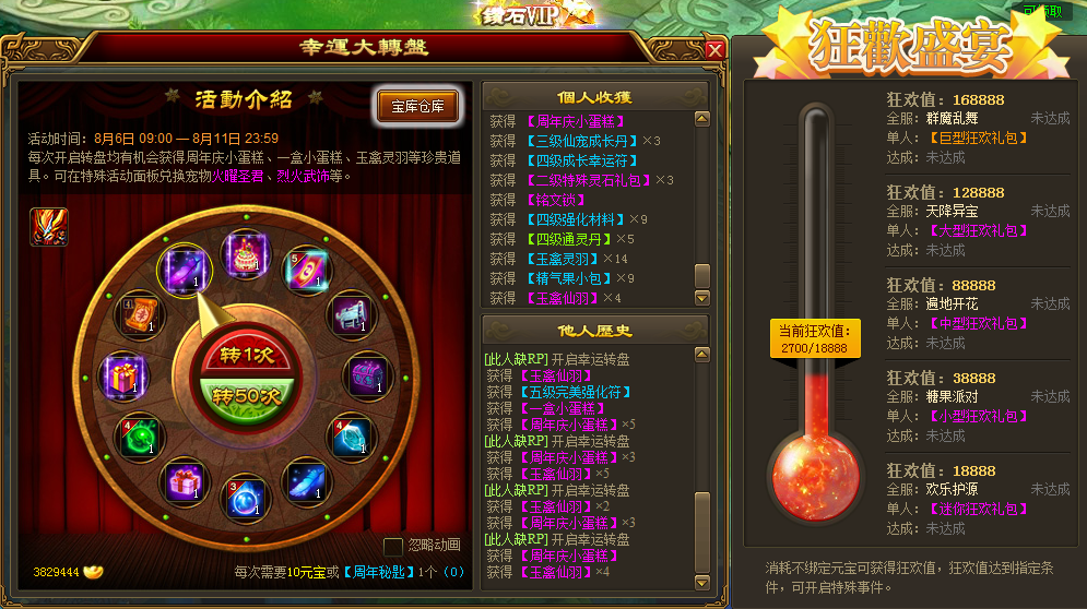 “狂欢不停”:全服所有玩家消耗不绑定元宝都可以让本服狂欢值上涨,每消耗1不绑定元宝全服狂欢值增加1,当狂欢值达到18888、38888、888888、128888、168888的时候,可以触发全服性事件;