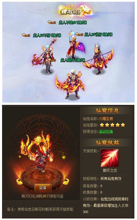宠物“火曜圣君”技能为毁灭之炎,出战或附身有效,最高等级增加主人火攻300;